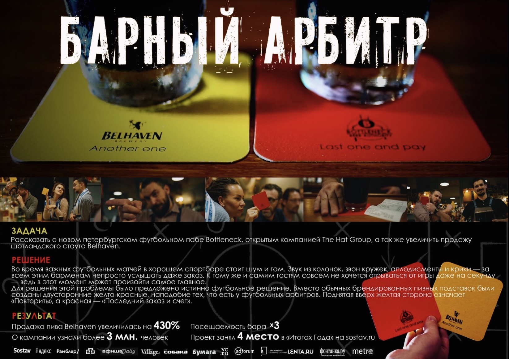 Петербургский паб"Bottleneck", открывшийся в мае 2018 года от легендарных The Hat Group и шотландский cтаут «Belhaven» превратили гостей в футбольных арбитров. Поистине футбольный заказ пива продемонстрировали в петербургском пабе в самом центре Санкт-Петербурга!Многие спортбары похожи друг на друга, и The Hat Group совместно с шотландским стаутом Belhaven и агентством «Декабрист» решили придать индивидуальности через простой, веселый и футбольный способ заказа пива. Во время важных футбольных матчей в хорошем спортбаре стоит шум и гам. Звук из колонок, звон кружек, аплодисменты и крики- за всем этим барменам непросто услышать даже заказ. Да и так не хочется отрываться от игры даже на секунду- ведь в этот момент может произойти самое главное. Для решения этих проблем, агентство «Декабрист» предложило истинно футбольную идею. Вместо обычных брендированных пивных подставок были созданы двусторонние желто-красные, наподобие тех, что есть у футбольных арбитров. Поднятая вверх желтая сторона означает «Повторить», а красная — «Последний заказ и счет».