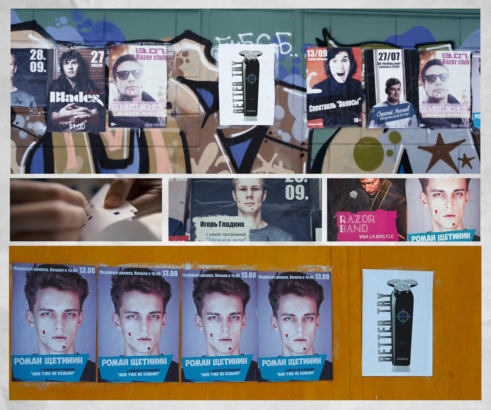 ИДЕЯ. Мы делаем транспарантные наклейки в виде оторванных кусочков бумаги разного размера с эффектом пятна крови, а так же стилизуем наши фэйковые постеры под настоящие афиши разных музыкантов и музцкальных групп, которыми заклеино большинство переулков, стен и заборов города.