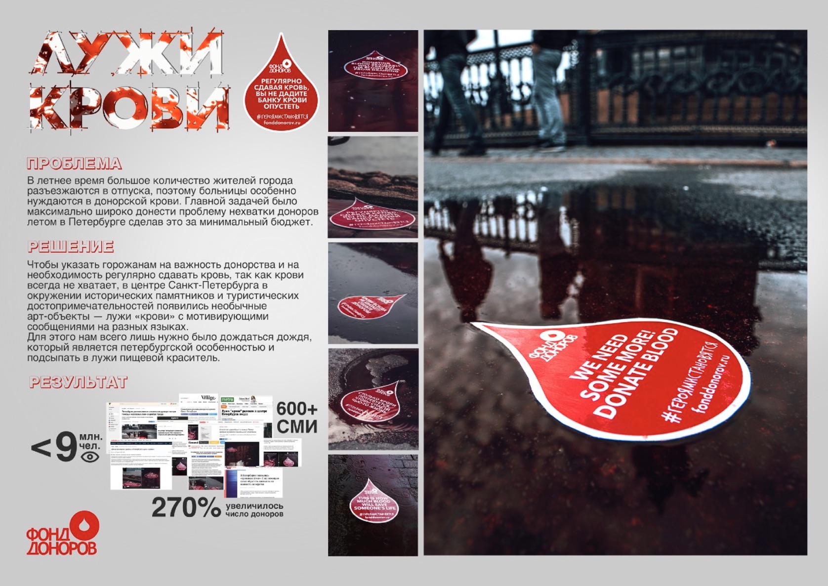 На этот раз героем сюжета стал сам город. В центре Петербурга в окружении исторических памятников и туристических достопримечательностей появились необычные арт-объекты — красные лужи с сообщениями на русском и английском языках о важности донорства и необходимости регулярно сдавать кровь.