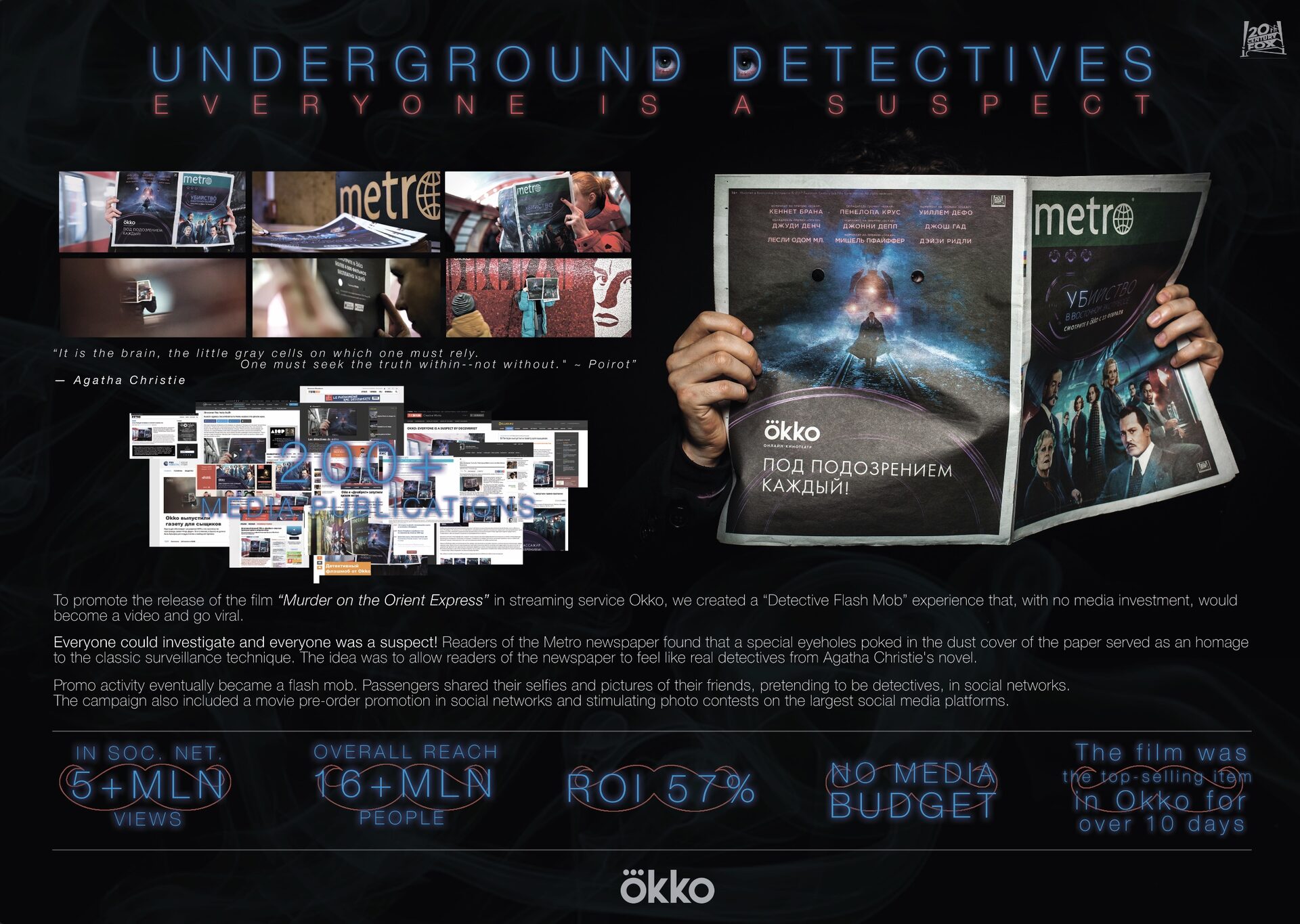 Необычная рекламная кампания, приуроченая к выходу фильма «Убийство в «Восточном экспрессе», стартовала выходом брендированной креативной обложки газеты «Метро» в Санкт-Петербурге. Cпециальные прорези для глаз в суперобложке газеты должны отсылать читателей к традиционному приему слежки из классических детективов. Аудитории издания предлагается почувствовать себя настоящими сыщиками из произведений Агаты Кристи. В рамках кампании «Под подозрением каждый» также запущена реклама предзаказа фильма в социальных сетях и стимулирующие фотоконкурсы на ведущих платформах в соцмедиа. 12 февраля в петербургском метро, где распространялась газета с необычной обложкой, прошли съемки ролика о том, как пассажиры реагировали на необычную рекламу.